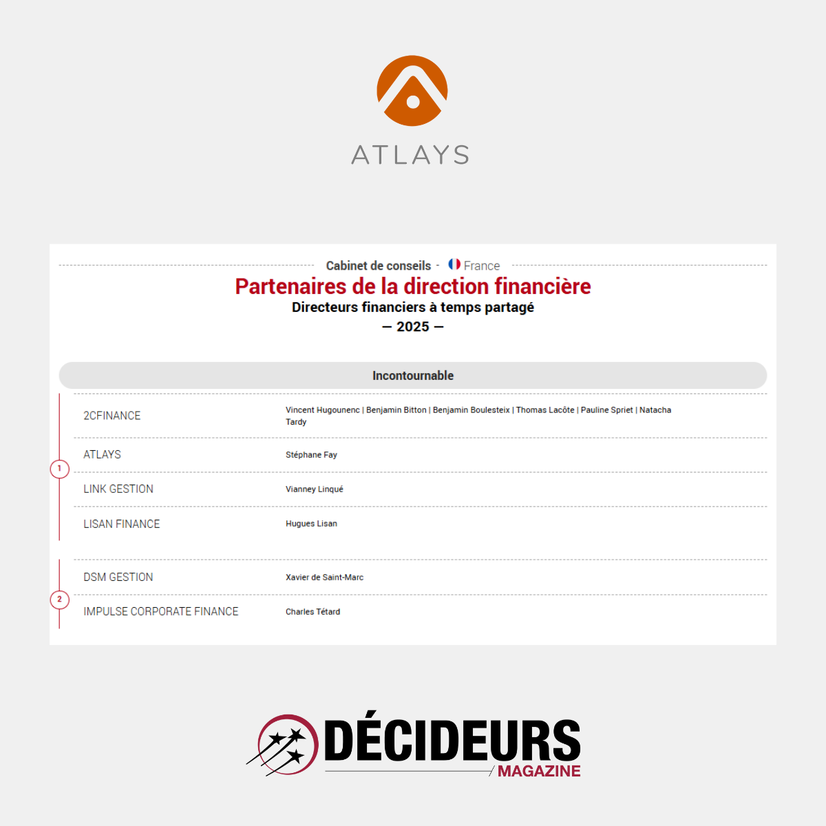 Cette année encore, Atlays figure parmi les “Incontournables de la direction financière à temps partagé” dans le classement annuel de Décideurs Magazine !